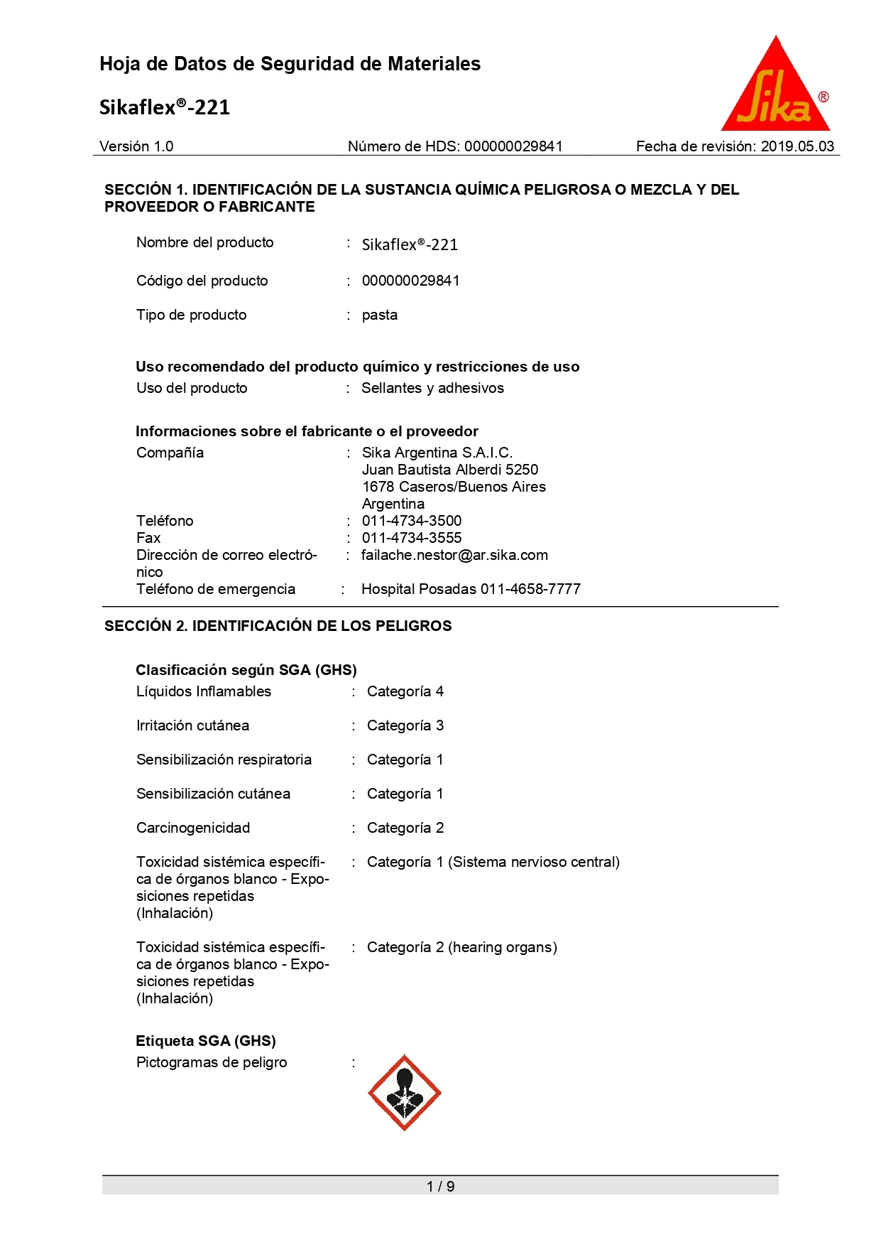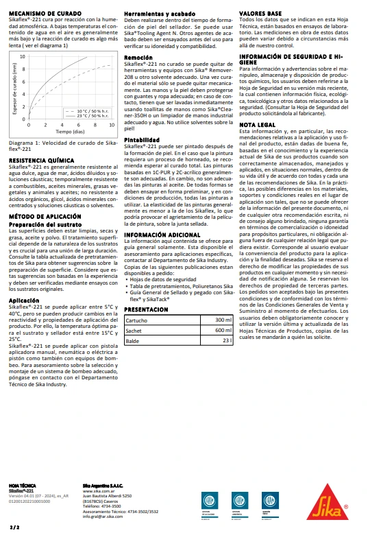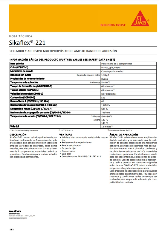 Sikaflex®-221 es un sellador/adhesivo de poliuretano multiuso de un 1-componente, y de alta calidad, que adhiere muy bien sobre una amplica variedad de sustratos, tales como metales, metales pintados con bases y sistemas de 2 componentes, materiales cerámicos y plásticos. Es adecuado para realizar sellados con elasticidad permanente.