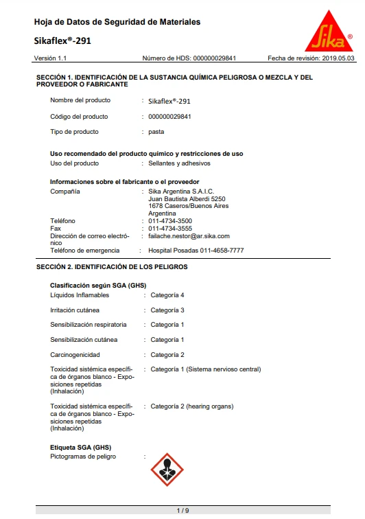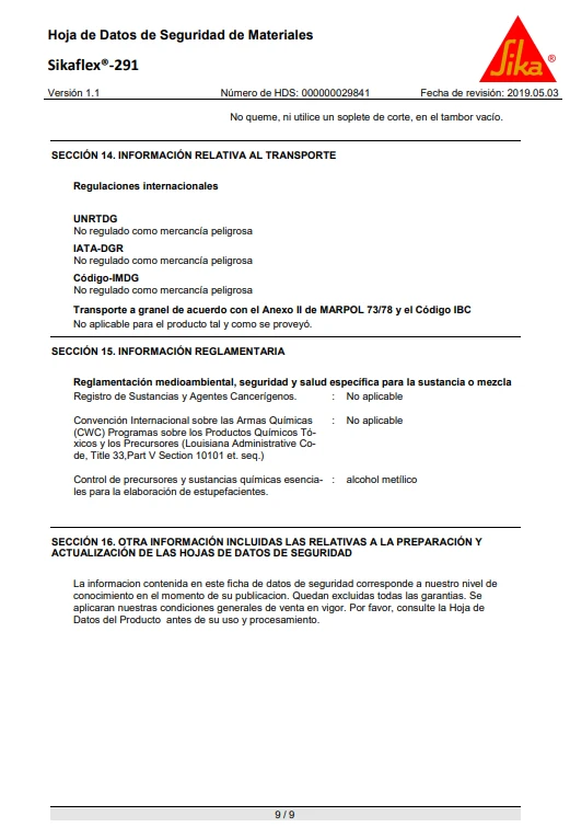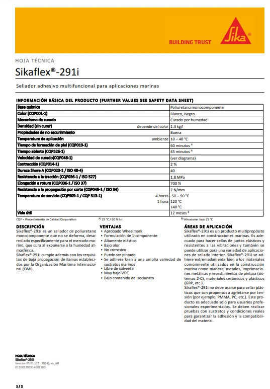 Sikaflex®-291i es un sellador de poliuretano de 1 componente sin pandeo desarrollado específicamente para el mercado marino, que cura la exposición a la humedad atmosférica. Sikaflex®-291i cumple con los requisitos establecidos por la Organización Marítima Internacional (OMI).