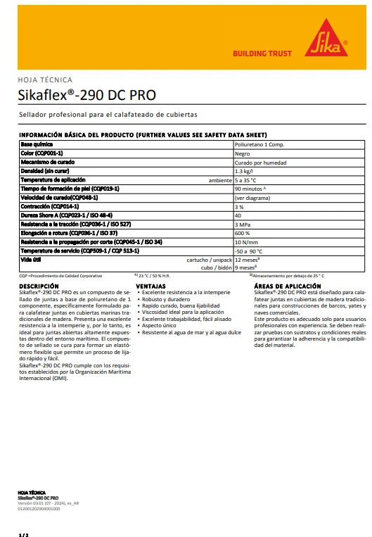 Sikaflex®-290 DC PRO es un compuesto de sellado de juntas a base de poliuretano de 1 componente, específicamente formulado para calafatear juntas en cubiertas marinas tradicionales de madera. Presenta una excelente resistencia a la intemperie y, por lo tanto, es ideal para juntas abiertas altamente expuestas dentro del entorno marítimo. El compuesto de sellado se cura para formar un elastómero flexible que permite un proceso de lijado rápido y fácil.